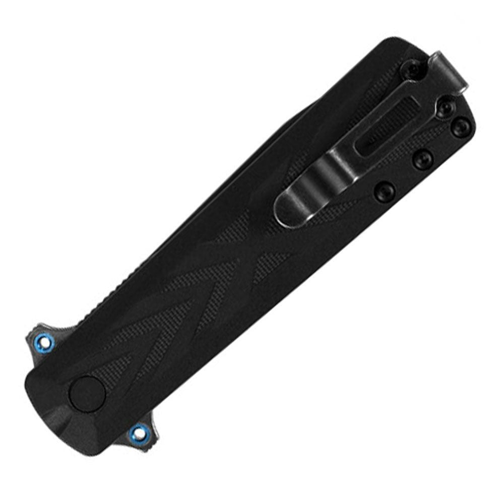 Everything about this slim folding dagger is simple, direct, and ready. The straight spear-point blade is sharpened on a single side. The handle has glass-filled nylon scales with heavy arrow-patterned texture to enhance grip. The Barstow’s dark looks are set off by touches of subtle color—blue anodized tube spacers and rings in the flipper/fingerguard.
