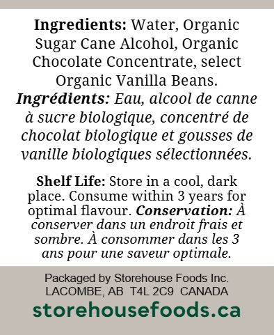 Ingredients: Water, Organic Sugar Cane Alcohol, Organic Chocolate Concentrate, select Organic Vanilla Beans.