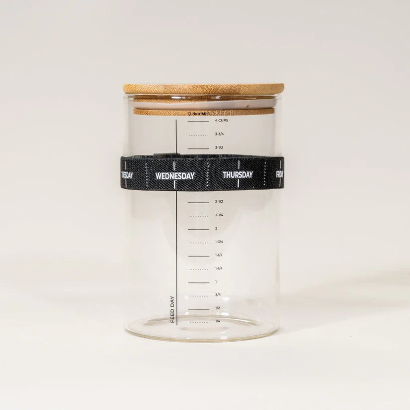 Upgrade your sourdough baking routine with the NutriMill 1-Quart Sourdough Starter Jar, the perfect tool for maintaining a large, healthy starter. Made from high-quality glass, this jar features easy-to-read measurements and a day marker band, allowing bakers to track feedings and monitor starter growth with ease. The bamboo lid provides a natural, breathable seal, ensuring optimal fermentation conditions.